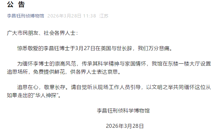 3月28日,李昌钰刑侦科学博物馆发文悼念李昌钰博士。
