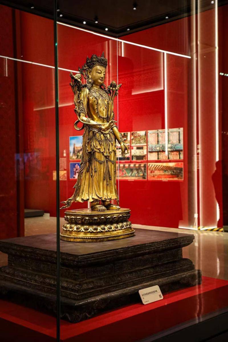 本次展览由专业策展团队精心打磨,通过精品文物、壁画临摹、数字科技、活态演绎、学术交流、非遗展示、文创开发七大维度,为观众打造全方位、沉浸式的文化体验。展览系统转化壁画数字化采集成果,通过高精度临摹壁画工艺抢救传承濒临失传的传统绘制技艺,借助数字影像载体全方位展现丝绸之路青海道千年文脉,让观众直观感受汉藏文化互鉴共生之美。原创情景舞剧《大明瞿昙》艺术再现各民族交往交流交融的壮阔历史,现场绘画演示、《瞿昙秘境》沉浸式VR体验则实现观众从“看壁画”到“入壁画”的跨越。展览精选文物84件/套、壁画临摹艺术品113件,其中包括再现远古先民生活的新石器时代舞蹈纹彩陶盆,明代永宣宫廷造像巅峰之作——明永乐款鎏金铜观音菩萨像,明代茶马互市国家信用凭证金牌信符,见证丝路繁华的唐代镶绿松石金链等。